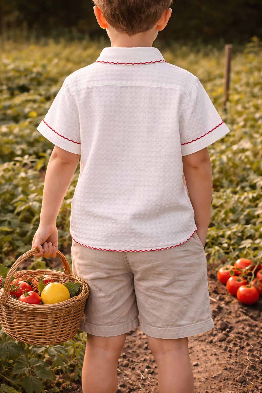 This crisp white short-sleeved shirt captures the charm of sun-soaked gardens with its delicate tomato and lemon embroidery. Crafted from a softly textured cotton with subtle grid detailing, it feels fresh, playful, and perfectly tailored for warm summer days.