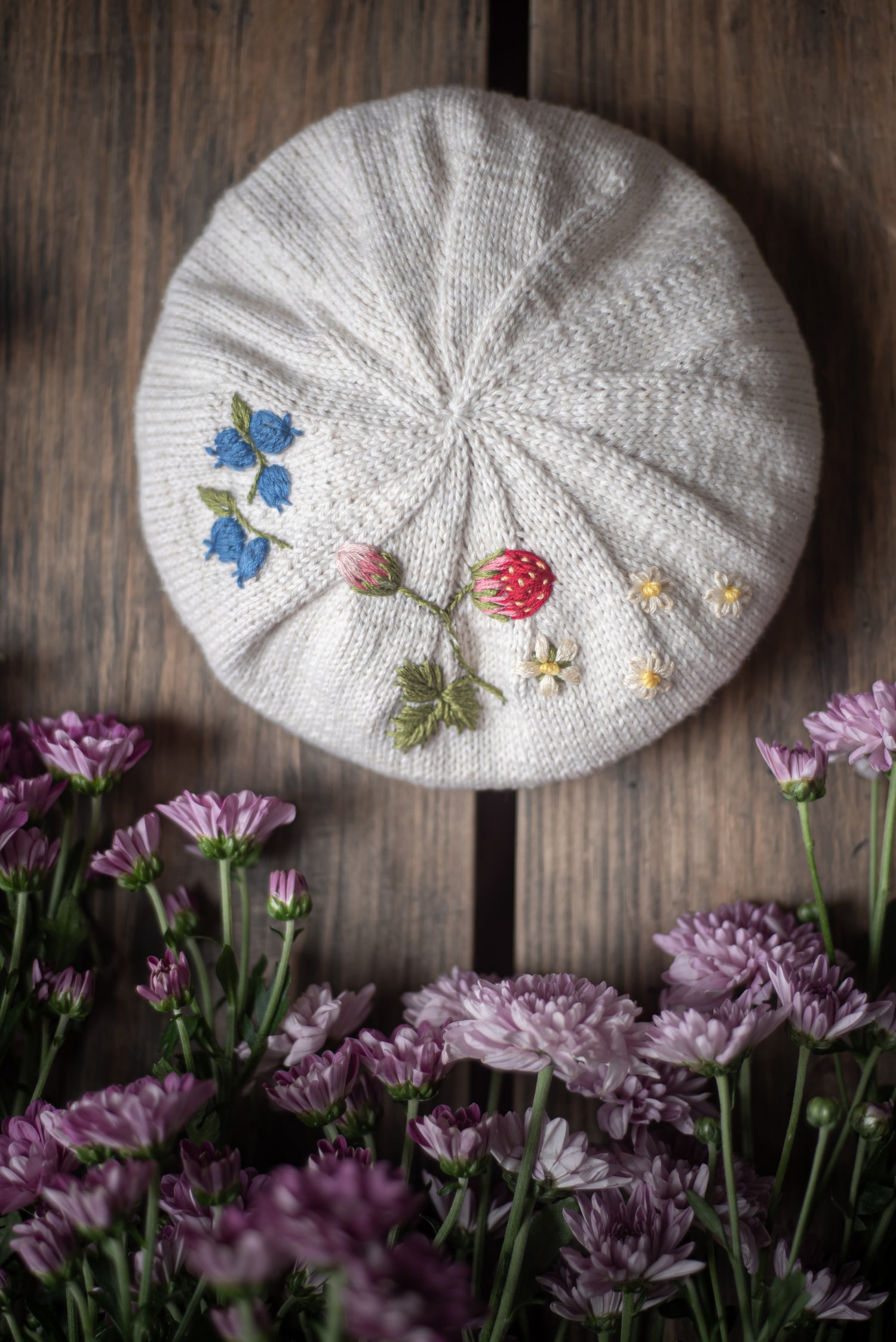 A super cute beret with hand embroidery, hand-knitted from soft vegan cotton.